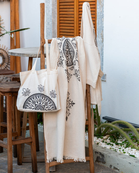 Discover ValentElle’s muslin kimonos, linen cover-ups, and artisan towels — all hand-printed and paired with matching totes and clutches.