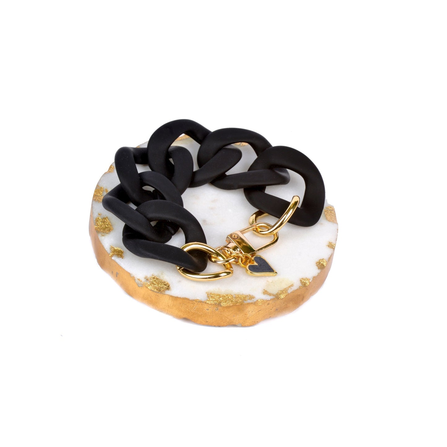 - Crafted from premium materials such as acrylic links, gold-plated aluminum, and stainless steel, this piece has a 3 cm width and measures 18 to 20 cm long when clasped. For added versatility, we have included a matching acrylic link or extension chain.